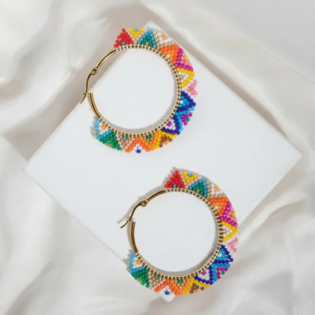 עגיל FIESTA | פיאסטה הוא עגיל חישוק מלא חיים, עשוי חרוזי מיוקי יפניים מקוריים בעבודת יד, במגוון צבעים עשיר ושמח.